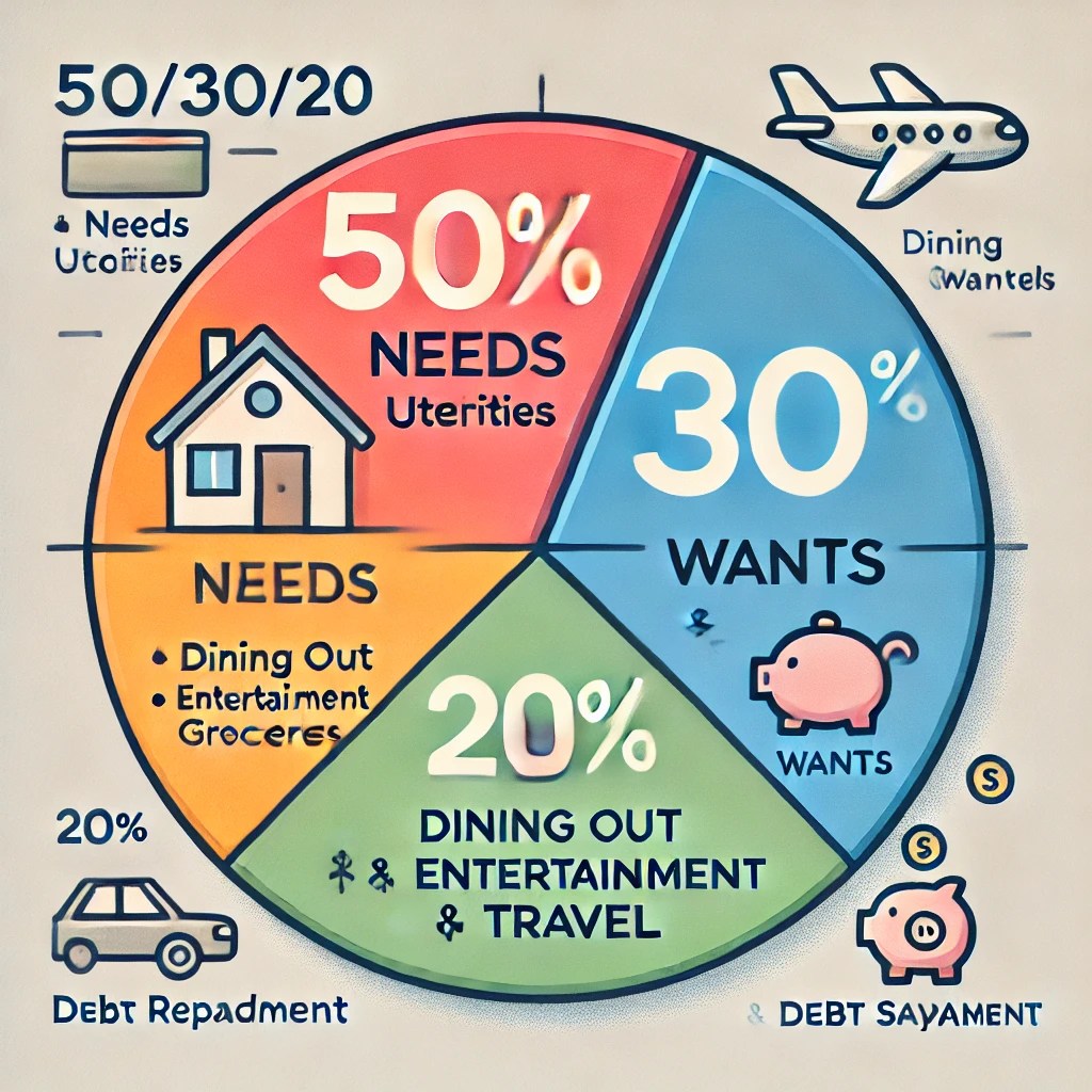 - 30% goes toward wants (dining out, entertainment, travel).
