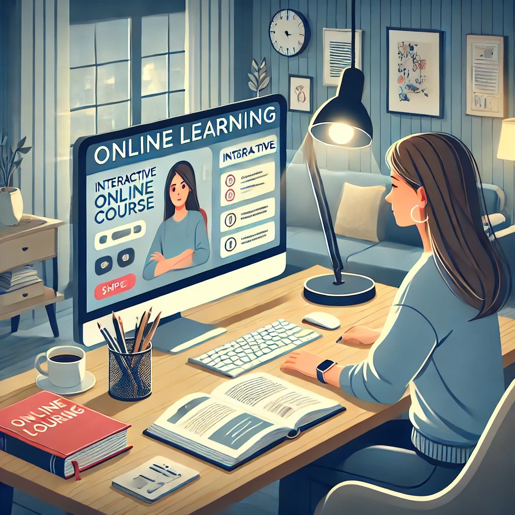 Here is the illustration depicting a modern online learning scenario with a young woman studying at home. The scene captures her at a desk in a well-lit room, engaged with an interactive online course. Her computer screen displays graphics and interactive elements from the course, and surrounding her are notes, textbooks, and a cup of coffee, creating a cozy and conducive learning environment. This visual highlights the personal and customizable aspect of online learning.
