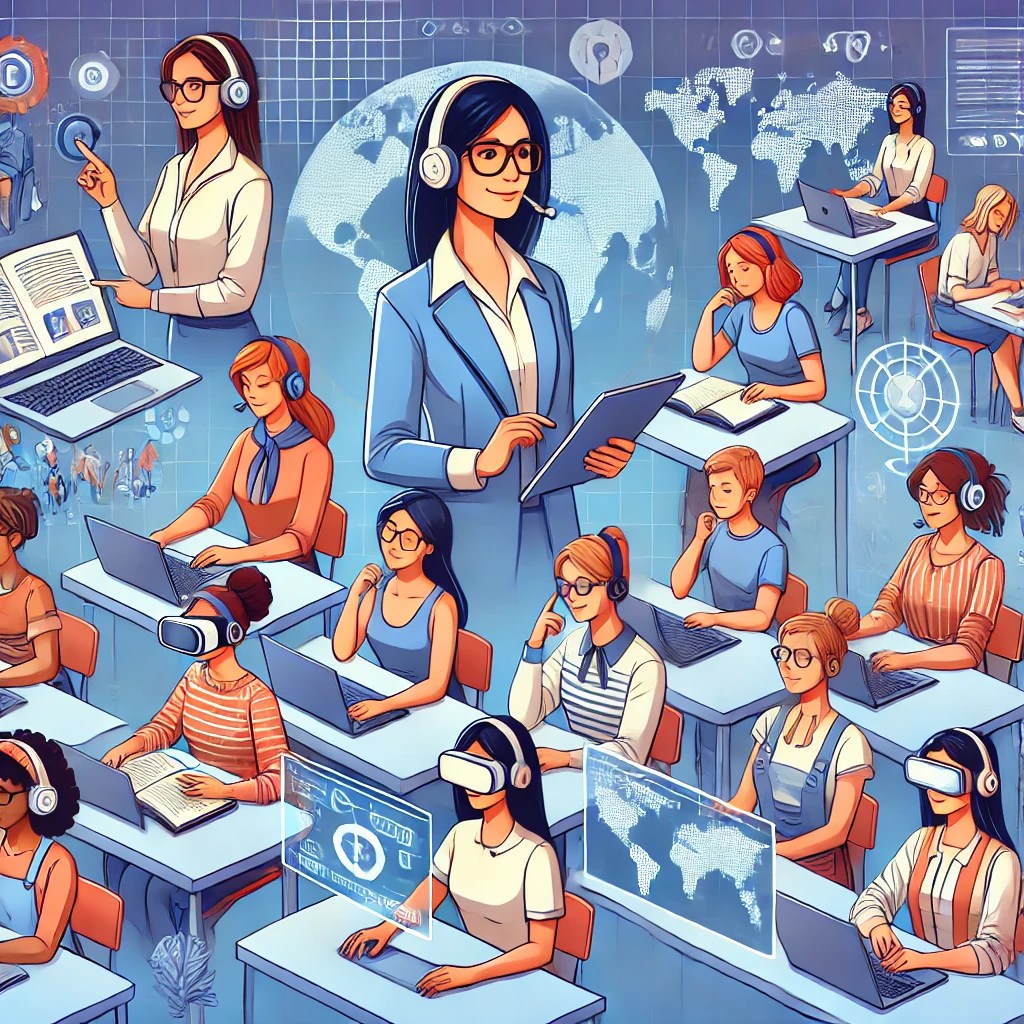 A diverse group of women engaged in learning through various online platforms. They are using laptops and tablets, and the scene includes books, digital icons, and a world map in the background, symbolizing global accessibility.