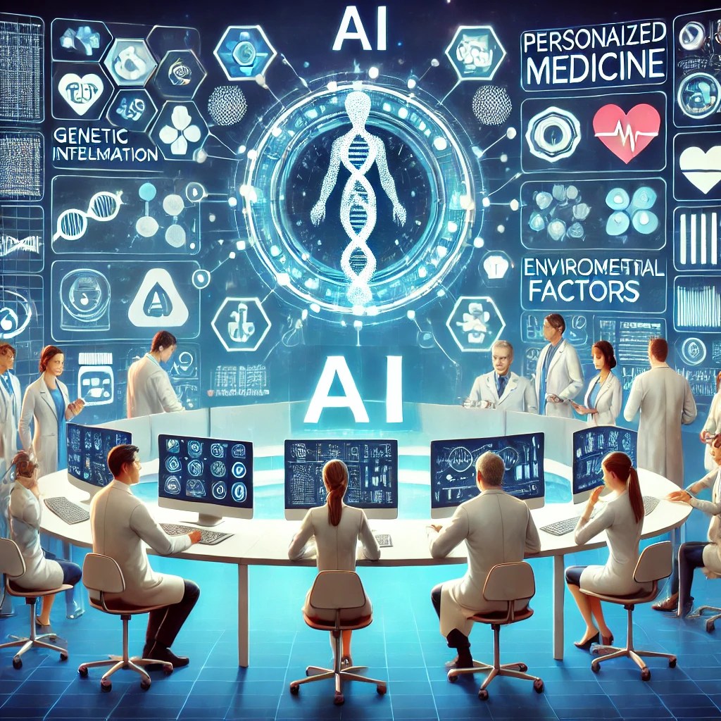 It includes visual elements of AI algorithms processing genetic information, environmental factors, and lifestyle data, highlighting AI’s role in enhancing diagnostic precision and tailoring treatment plans.