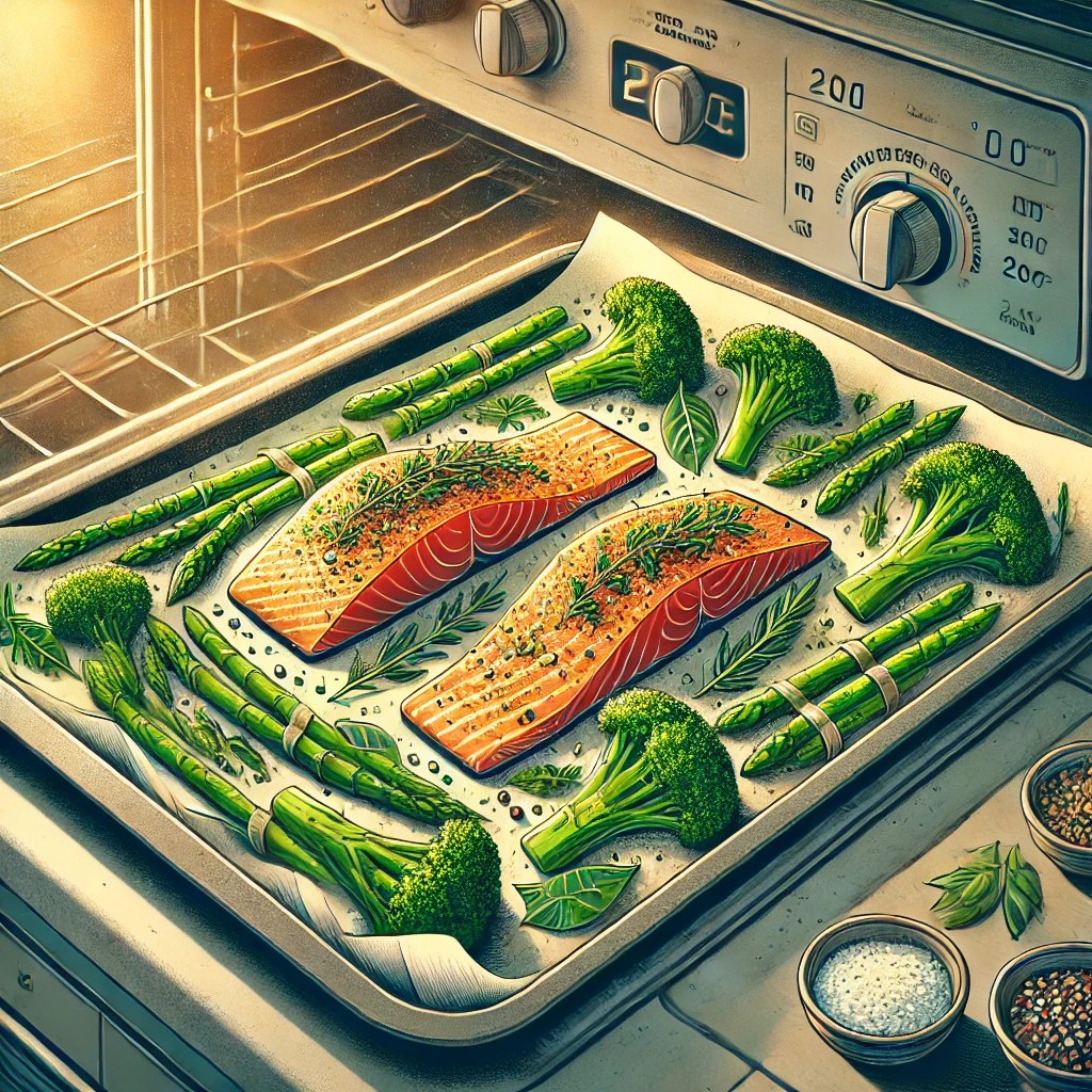 - Season the salmon and vegetables with olive oil, salt, pepper, and herbs.