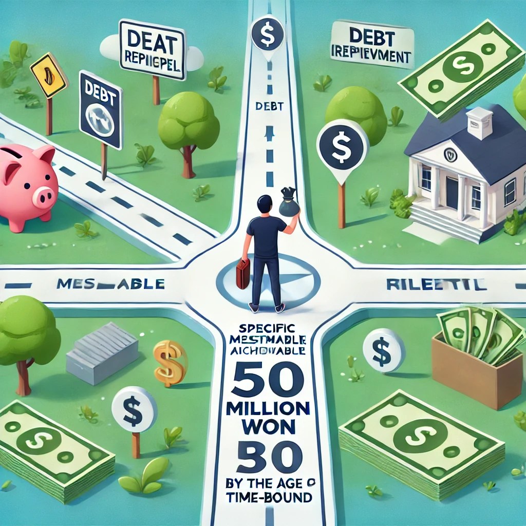 This images set clear financial goals, follow SMART principles, and represent a roadmap to becoming rich. Each milestone represents a specific goal setting, and the background includes symbols for financial independence and success.