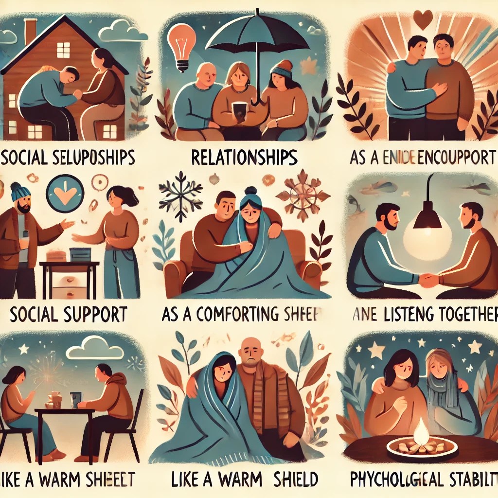Here’s an illustration showing relationships as a comforting and protective source of support during challenging moments. It captures the warmth and reassurance that friends and family provide.