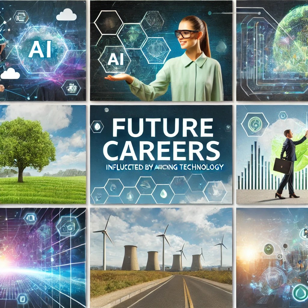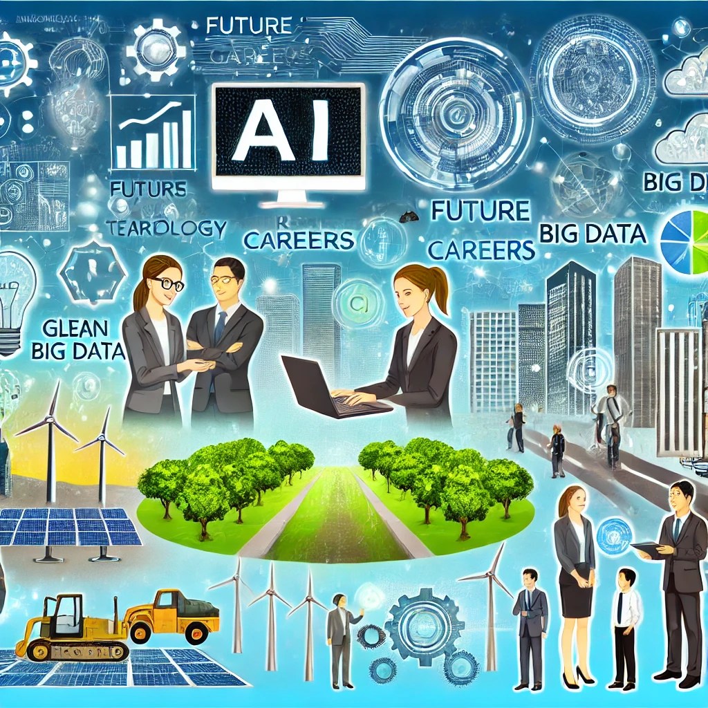 Here are illustrations representing future careers influenced by advancing technologies, highlighting roles in AI, green technology, and big data within futuristic settings.