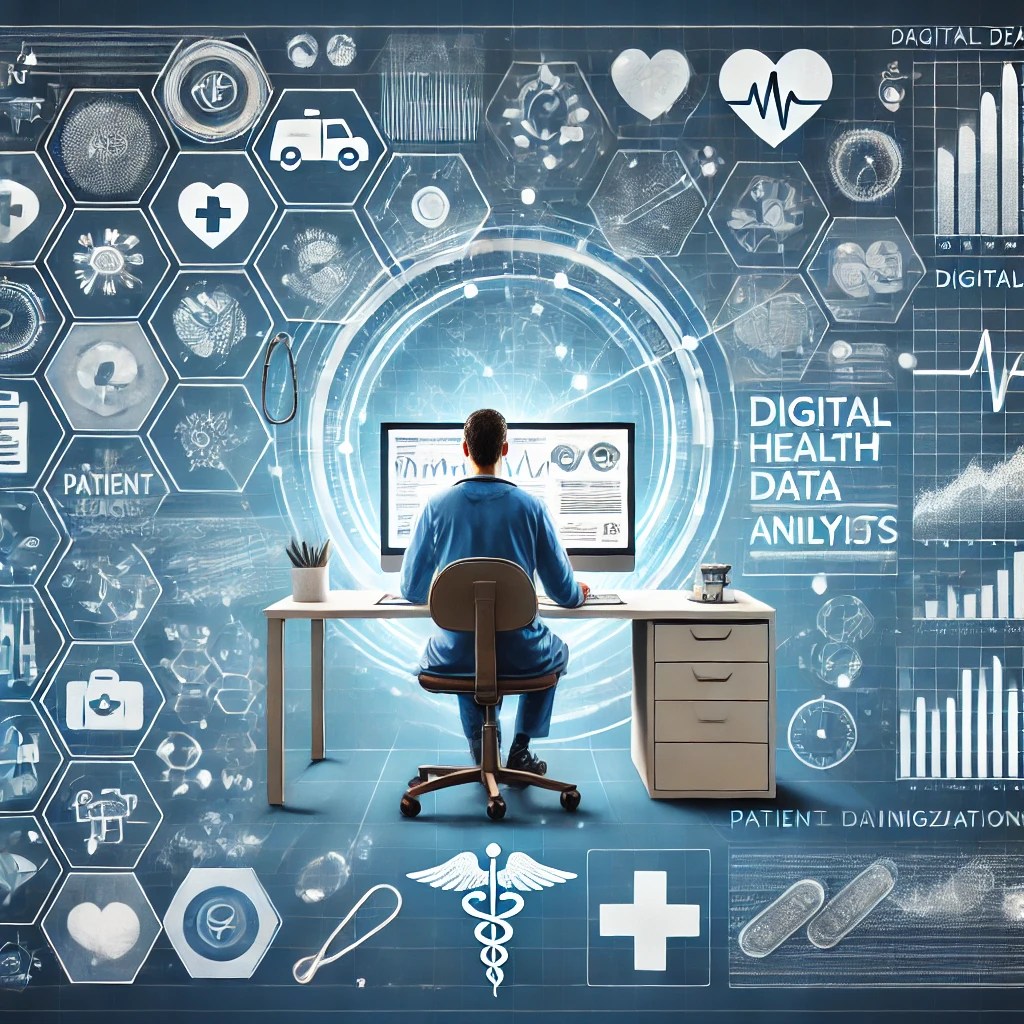 Here is an illustration highlighting the role of healthcare data analysts in digital healthcare, featuring elements like data visualizations, patient insights, and medical symbols to convey the integration of IT and healthcare.