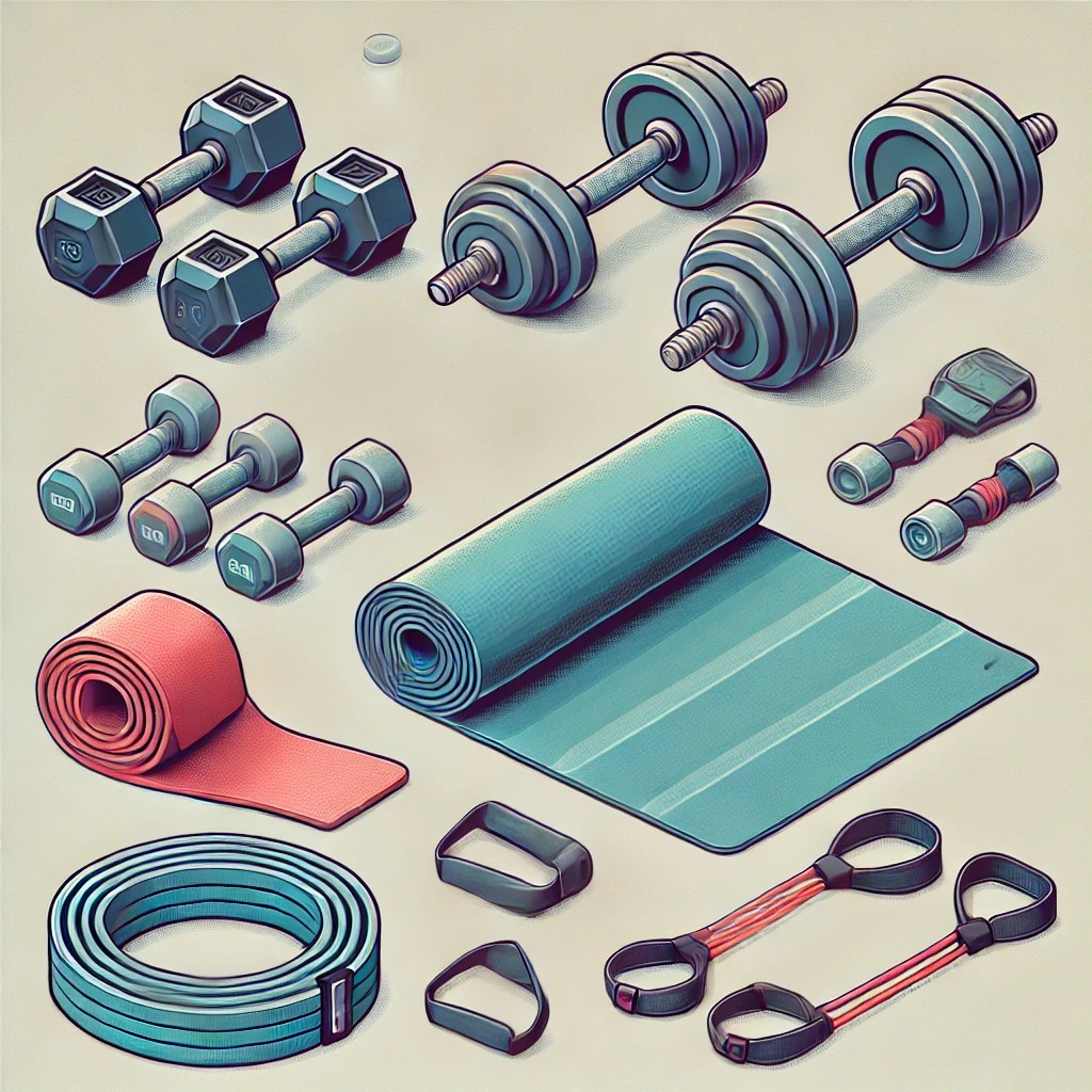 Here is the illustration showing a collection of essential home fitness equipment: dumbbells, a yoga mat, and resistance bands. This visual guide can help you understand the basic tools needed for a home workout setup.