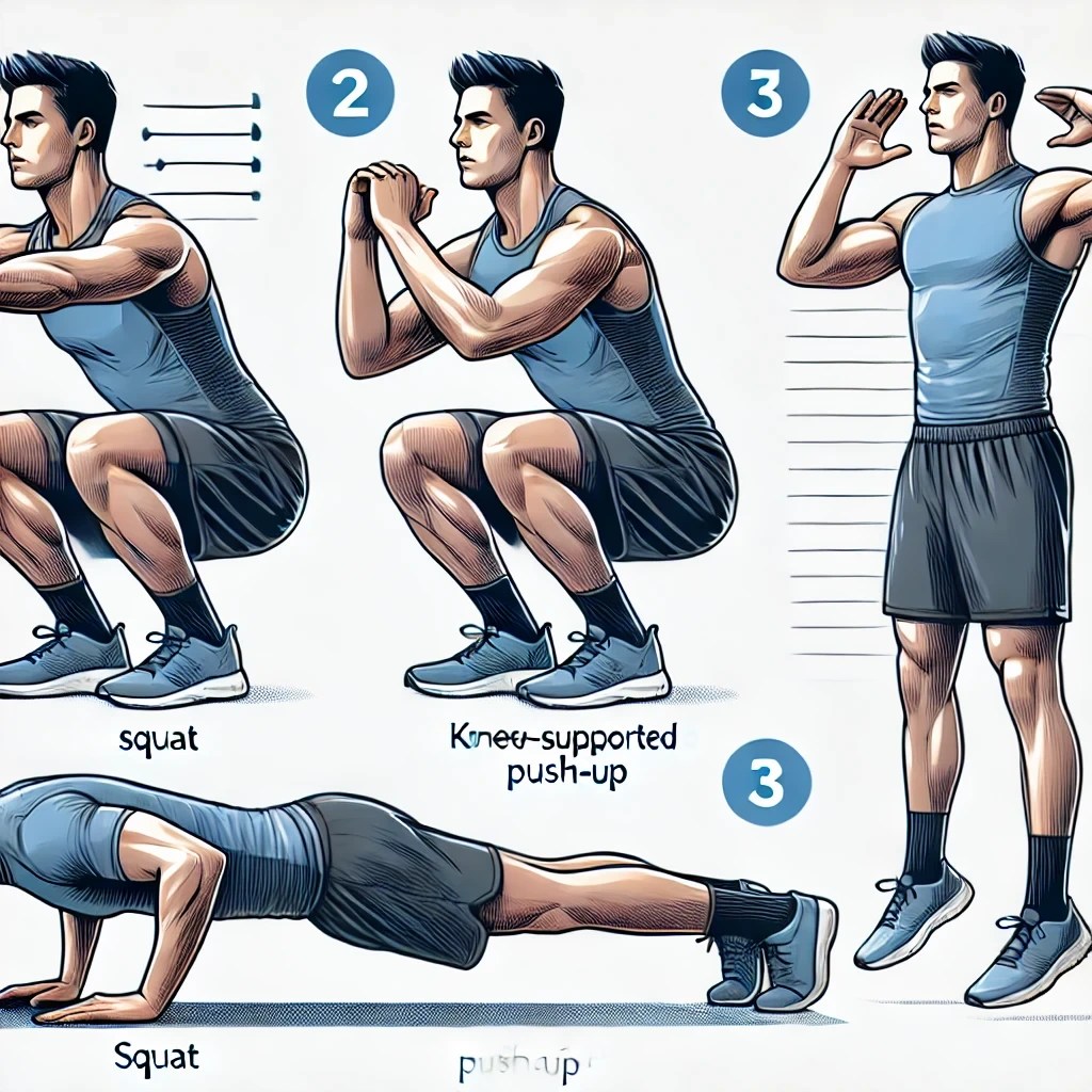 - Push-Ups: Great for building the chest, shoulders, and arms. Beginners can start on their knees.