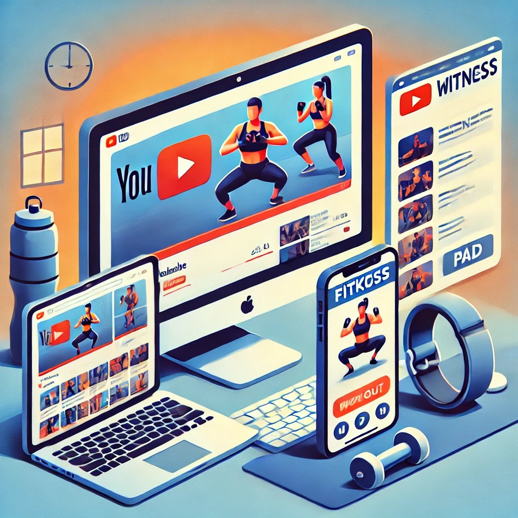 Here is the illustration showing a variety of online fitness programs available for home workouts, including a YouTube workout video, a fitness app interface on a smartphone, and a paid fitness program on a tablet. This visual can help you explore the different digital options for maintaining fitness at home.