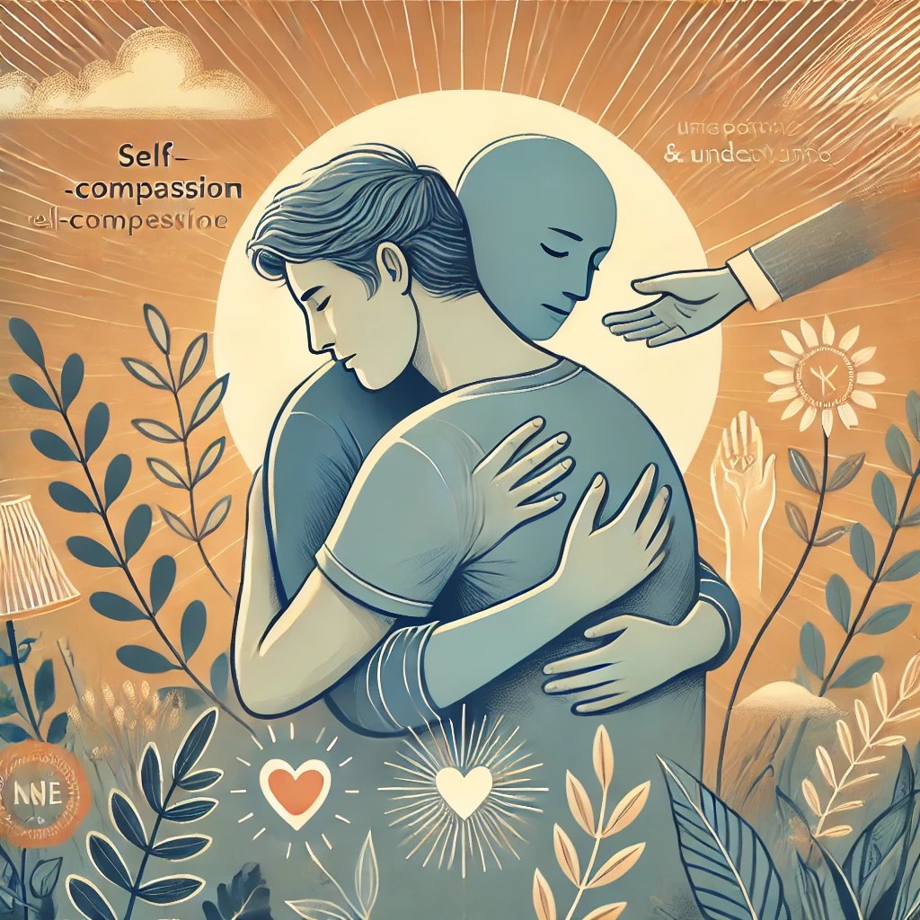 Here is an illustration portraying the concept of self-compassion and self-acceptance, showing warmth, inner peace, and nurturing.