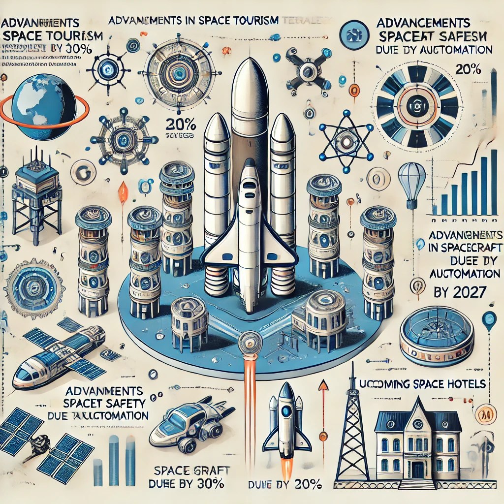 Here’s an infographic illustrating advancements in space tourism technology, with projected growth trends, safety enhancements, and expected features of space hotels.