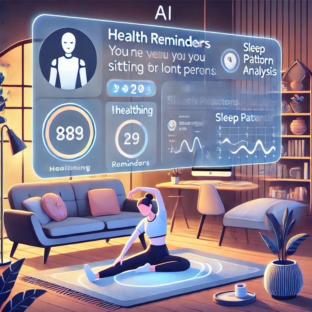 It features a scene where an AI assistant supports health care and provides users with stretching and sleep pattern analysis.