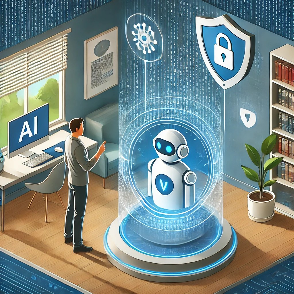 AI assistants and users can be seen interacting, with images representing data protection with enhanced security systems in the background. This is a scene that emphasizes the importance of data protection.