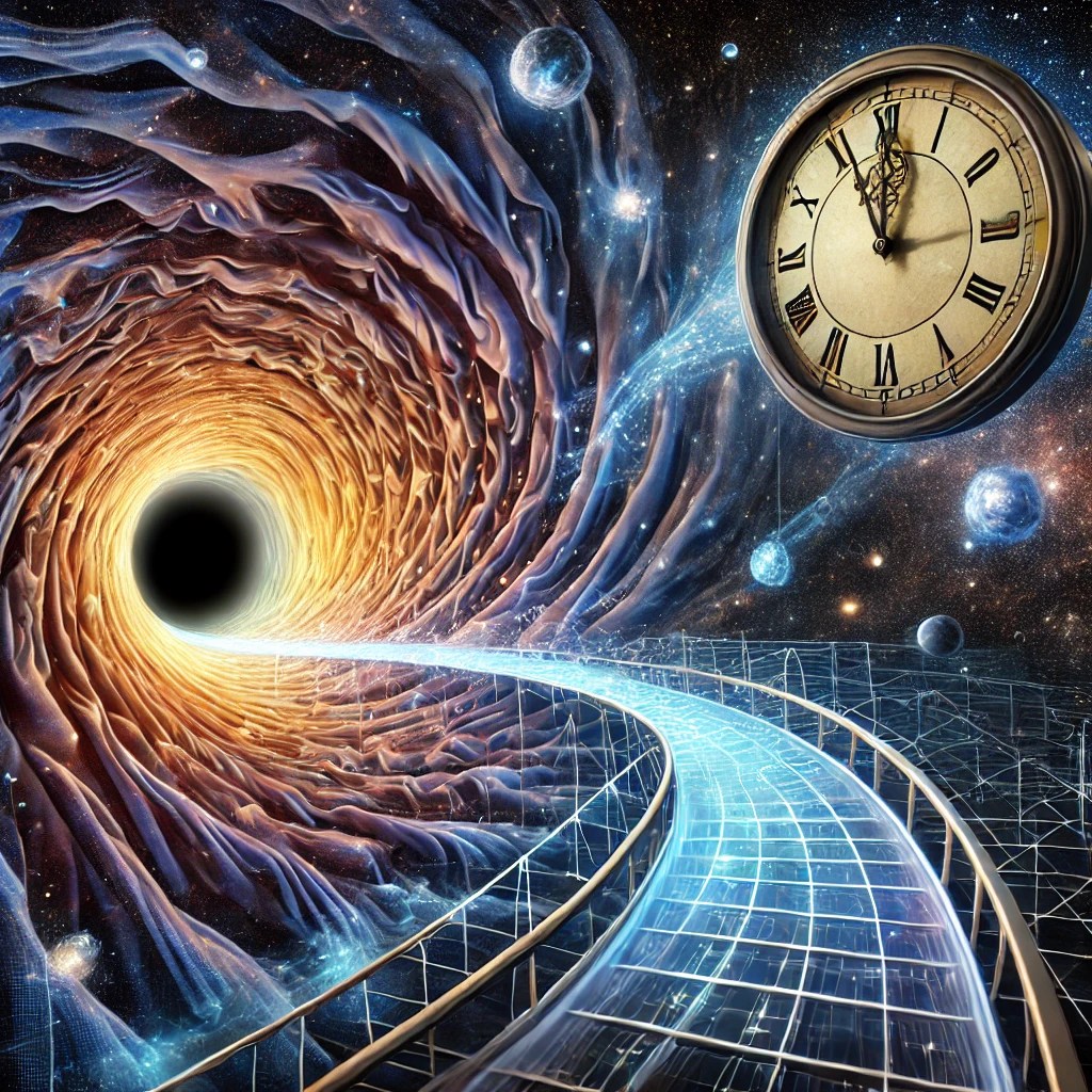 Here is an illustration that conceptually represents Einstein’s theory of relativity and time travel. The view of space-time bending around a black hole and the clock face representing time are combined with the cosmic background to symbolically represent the bending of time. Also included are corridors or tunnels that express theoretical possibilities of going back or forward in time.