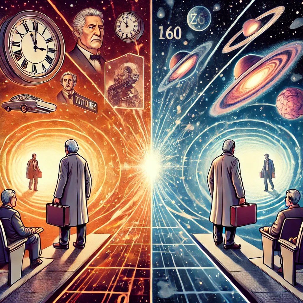 Here is an illustration on the theme of time travel related to the concept of a parallel universe. The image depicts a scene where time traveler ‘A’ creates a new universe in the 1960s by preventing his grandfather from seeing his future spouse. In one universe, ‘A’ does not exist because his grandfather cannot meet his spouse, while in the other original universe, ‘A’ continues to exist. It is expressed using divided dimensions or cosmological cracks that represent the separation of the universe..