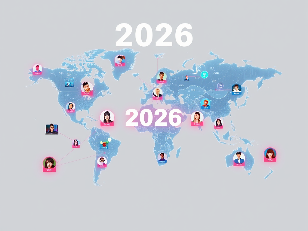 A 2026-style world map showing interconnected digital nodes, K-Pop avatars, streaming icons, gaming worlds, and AI interfaces radiating from South Korea.