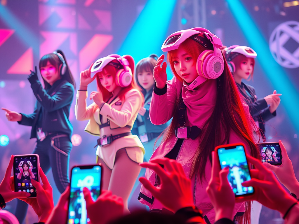 A hybrid K-Pop performance featuring human idols, virtual avatars, and fans interacting through mobile platforms in real time.