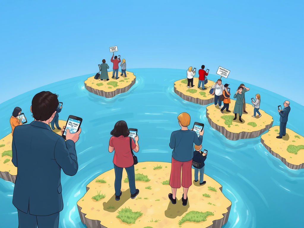 A divided society illustration showing people standing on separate islands, each looking at their phones with different news headlines.