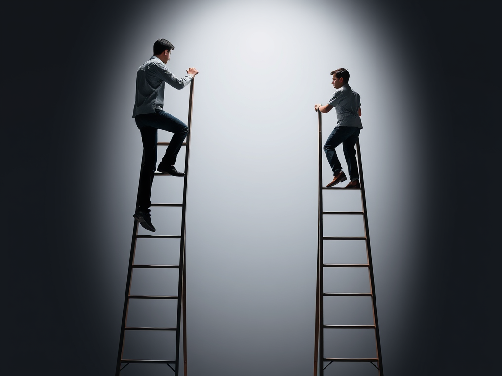 A visual metaphor showing two people climbing ladders of unequal height, symbolizing unequal opportunity.