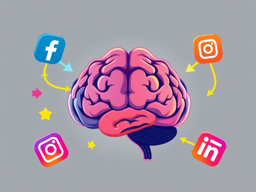 An illustration of a brain surrounded by social media icons, with arrows looping back to reinforce the same ideas.