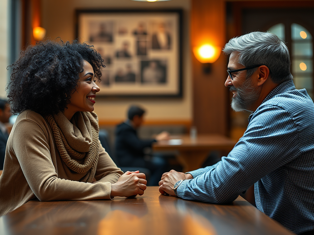 Two people from different backgrounds sitting across a table, talking calmly with warm lighting.