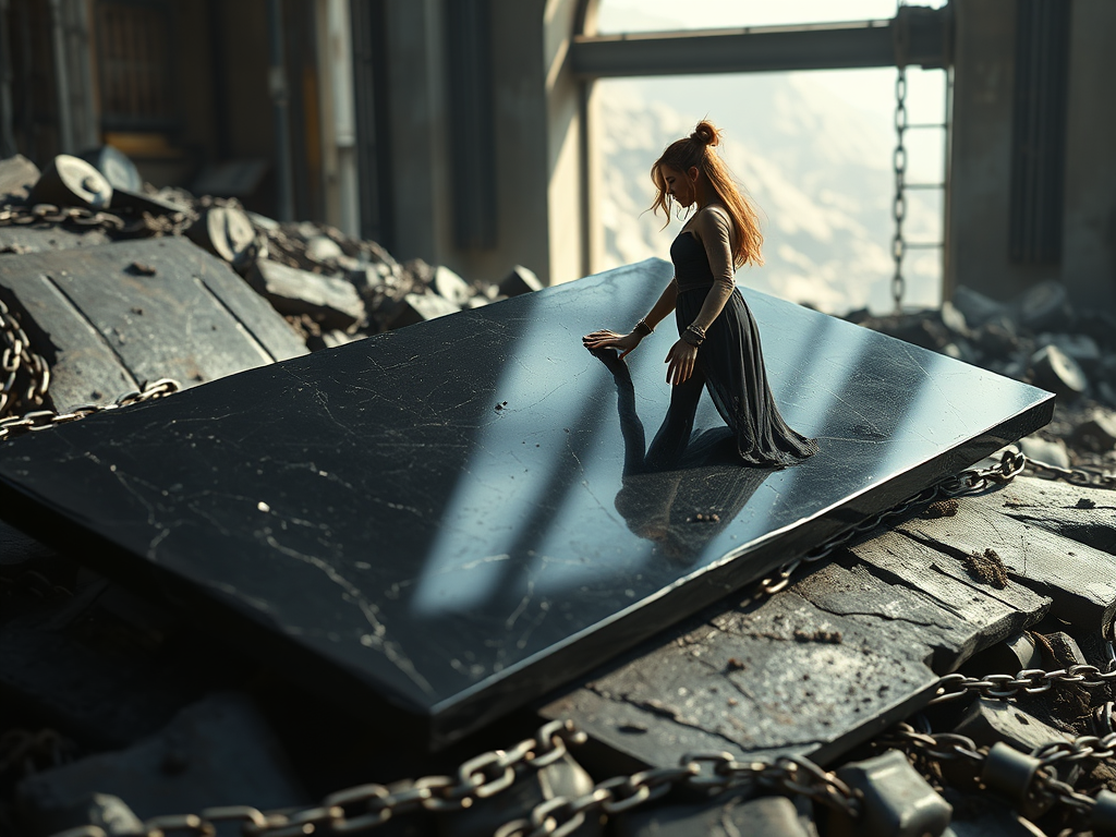 She came to a small, strange section of the pile. It wasn’t concrete; it was a large, flat slab of black, smooth Obsidian stone. The slab was slightly tilted, buried mostly under the steel.
