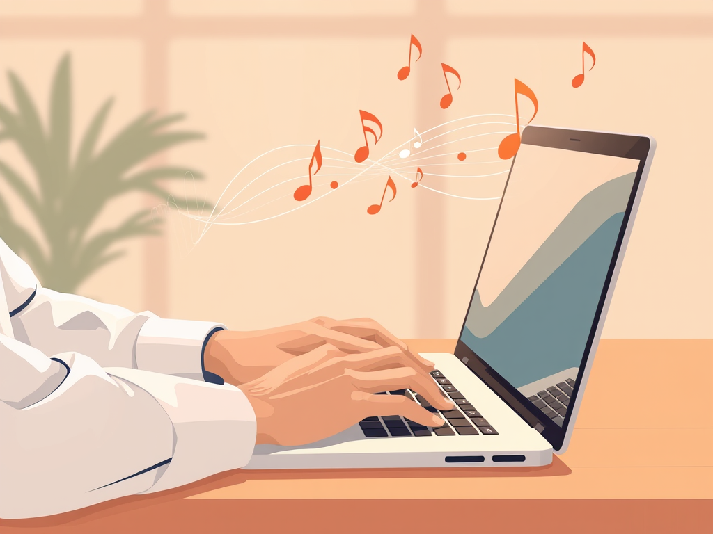 A clean, modern illustration of a person typing a music prompt into a laptop, with sound waves and musical notes forming in the air, minimal style, warm lighting.