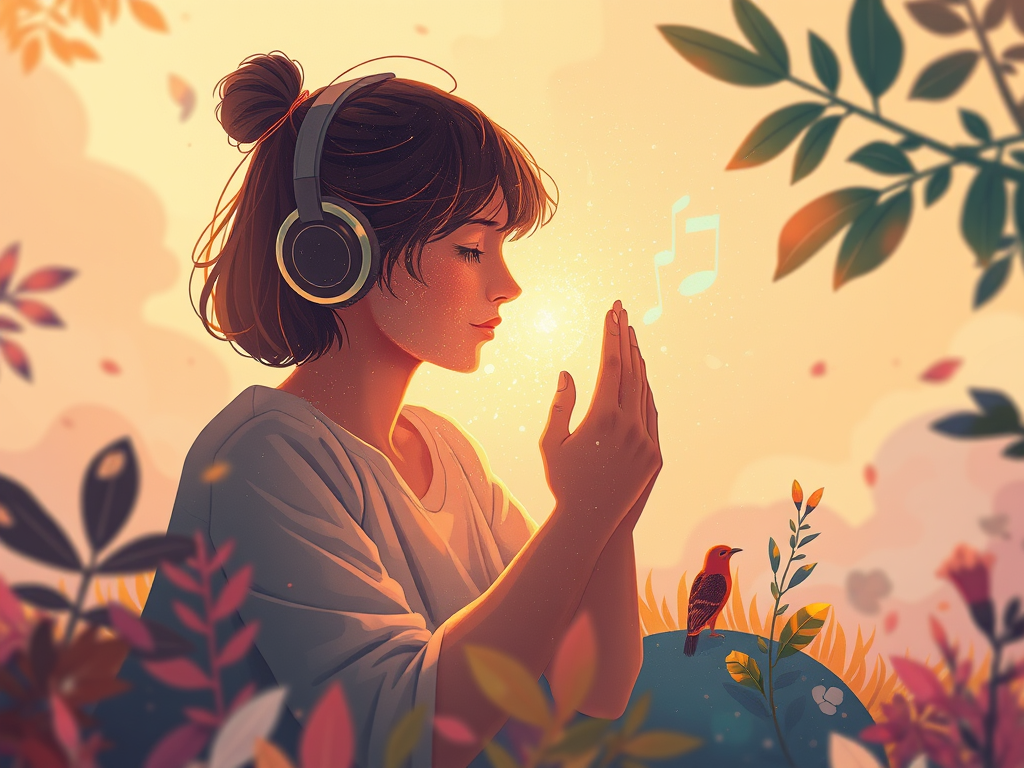 A conceptual illustration of human creativity merging with AI music visuals, warm and inspiring, not futuristic or cold.