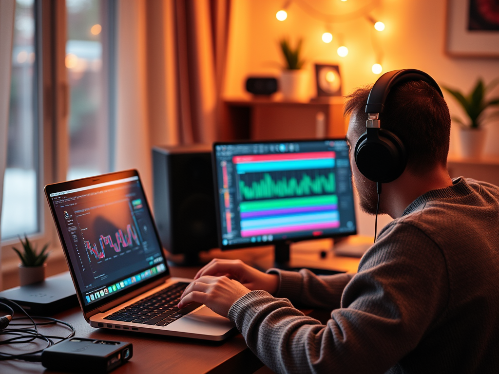 A home creator editing AI-generated music in a DAW on a laptop, cozy workspace, headphones, calm focus.