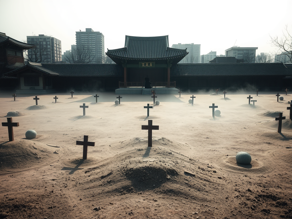 A misty burial ground blending traditional Korean symbols with modern urban shadows, eerie but respectful tone.