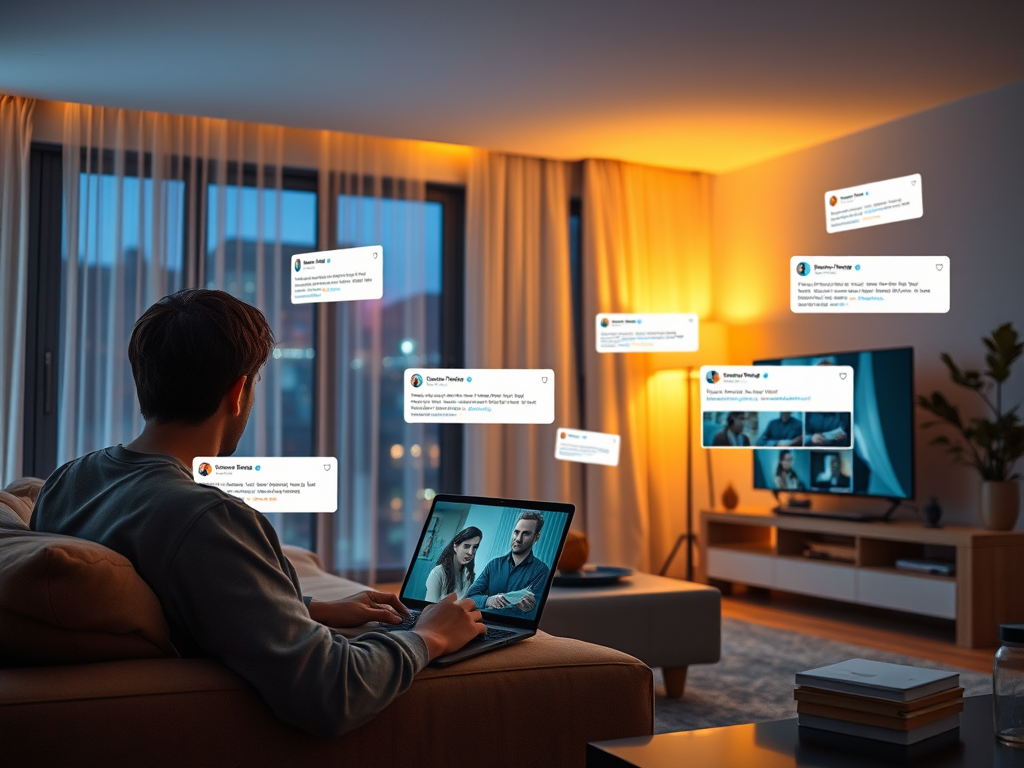 A modern living room at night, a person watching a drama on a laptop while social media reactions float softly in the air, warm cinematic lighting, reflective mood.