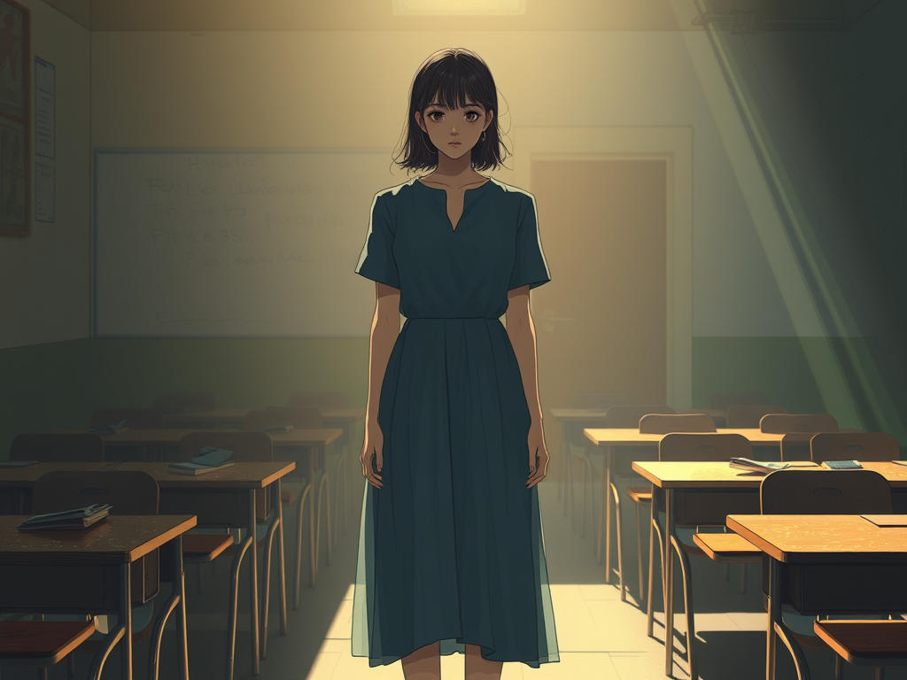 A symbolic illustration of a woman standing between light and shadow, broken school desks in the background, cinematic Korean drama style.