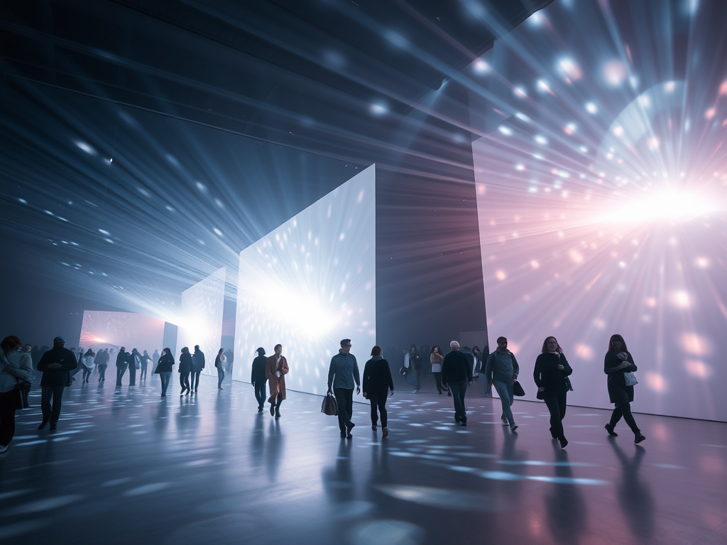 An immersive light exhibition with people walking through shifting beams of light, soft glow, contemplative atmosphere.
