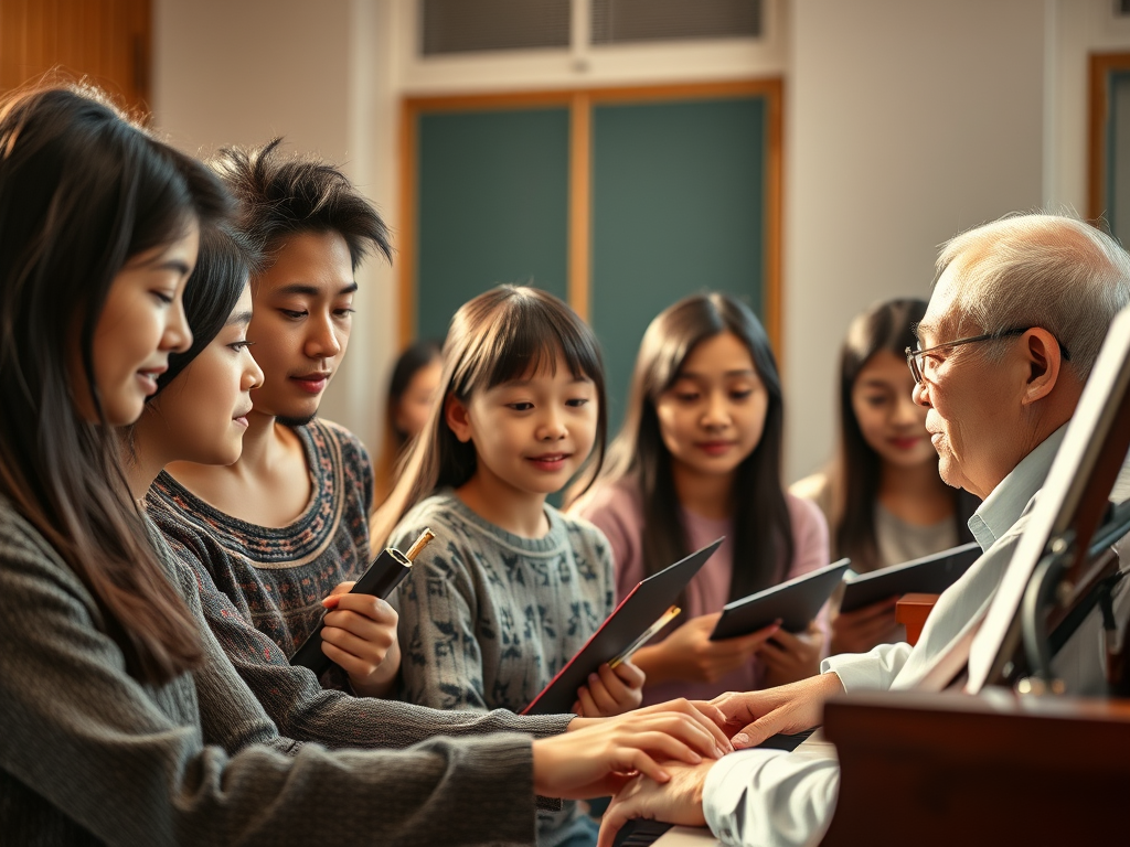 A diverse group of music students gathered around an older instructor with a piano, warm and natural lighting.