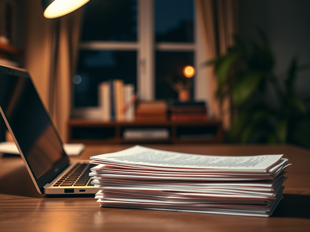 A quiet home office at night, with an unopened laptop and handwritten notes stacked nearby, symbolizing paused creativity.