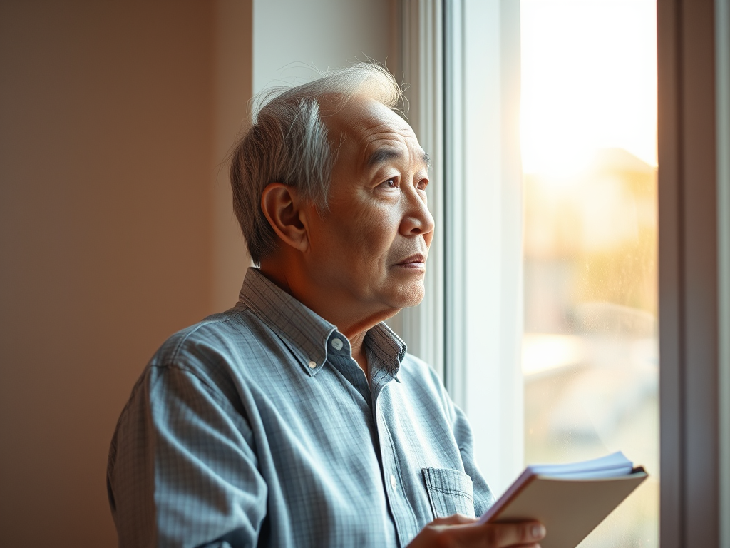 An older man looking out a window in the early morning light, notebook in hand, thoughtful and calm.